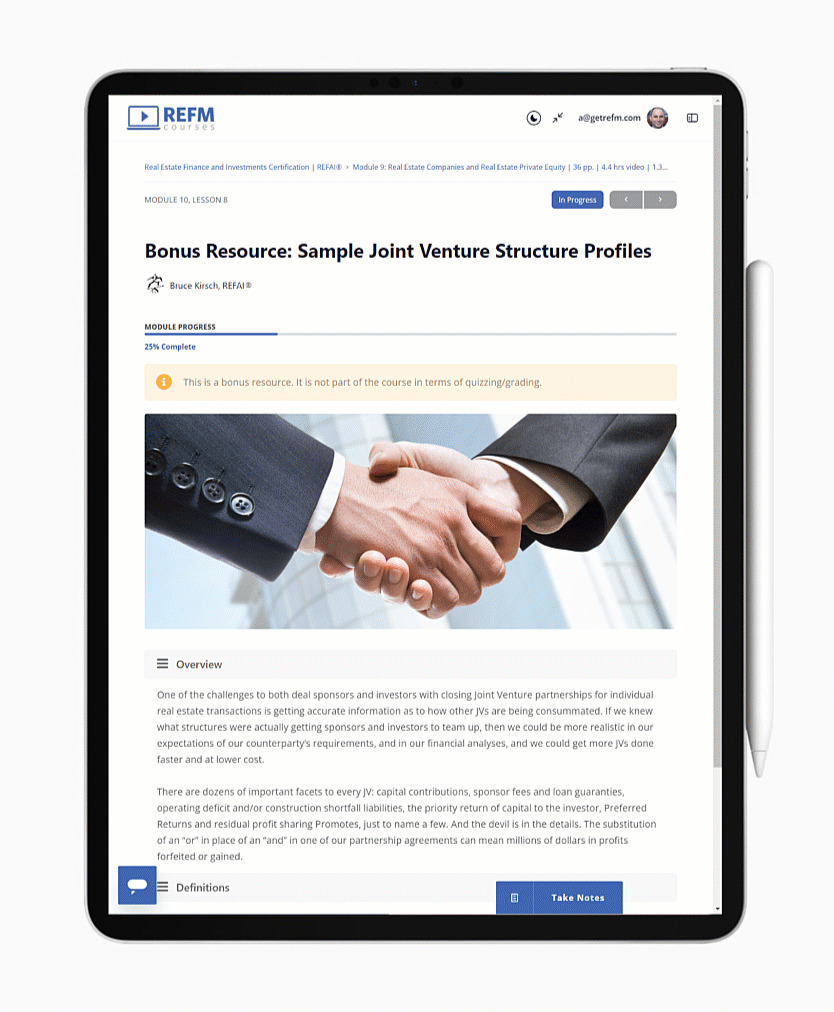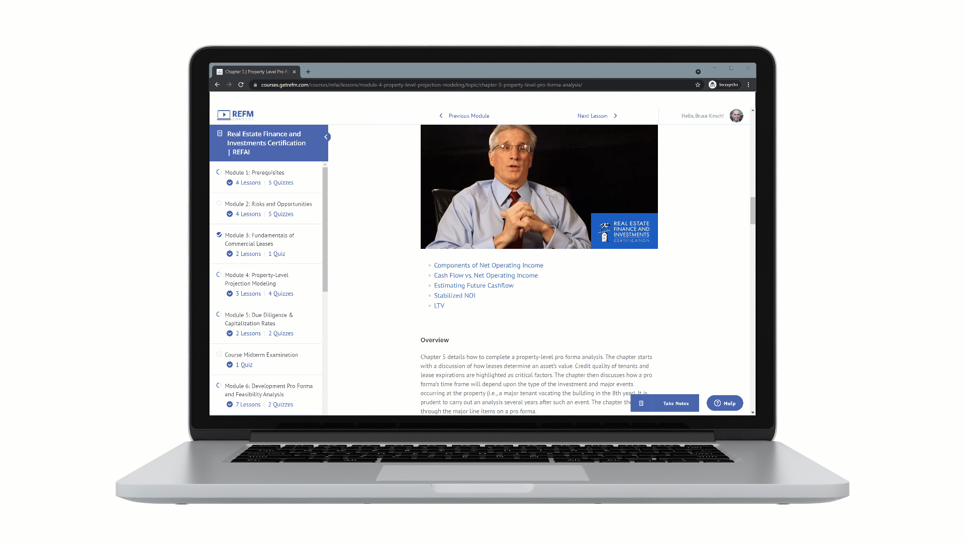The Real Estate Finance and Investments Certification (REFAI®) from Linneman Associates and Real Estate Financial Modeling is a rigorous educational self-study program that is focused on practical, high-impact outcomes for its candidates. Registration includes lifetime access to the course. The course can be taken with the goal of Certification, or just for one’s educational development. REFAI is delivered via a mobile-friendly online learning environment.