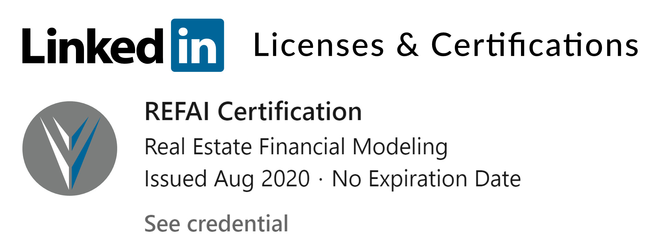 “I just want to say how amazing the REFAI course was overall. I really am pushing around twenty other younger college students to take this to get them ahead of the curve. It really does a great job of teaching you a topic through the book, then pounding it in your head through the lecture then understanding it analytically with the Excel. Thank you again.” – Chris Comet, USC